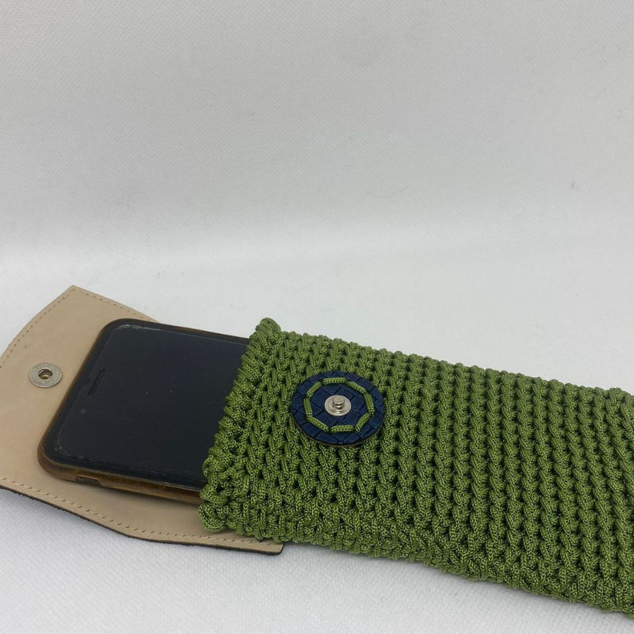 Elegante porta cellulare o porta occhiali da donna realizzato all’uncinetto, con patella in pelle artigianale.